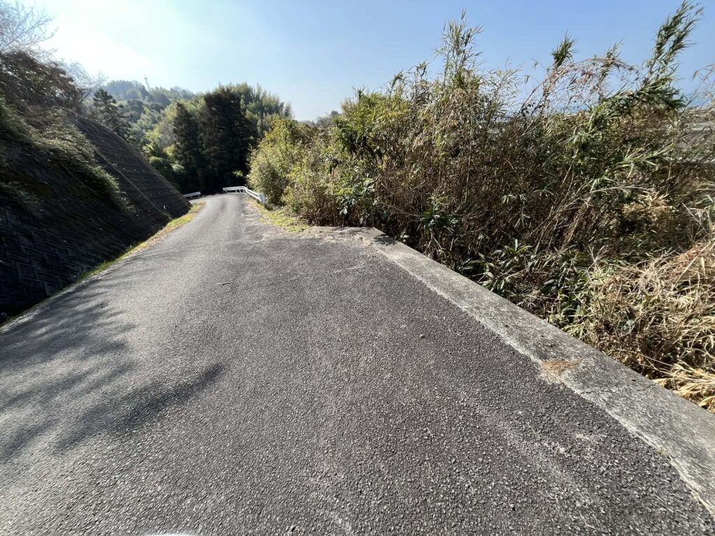 ここから道沿いに少し上ると、竹林があり、竹林とガードレールの端あたりで、右側に登る道があります。