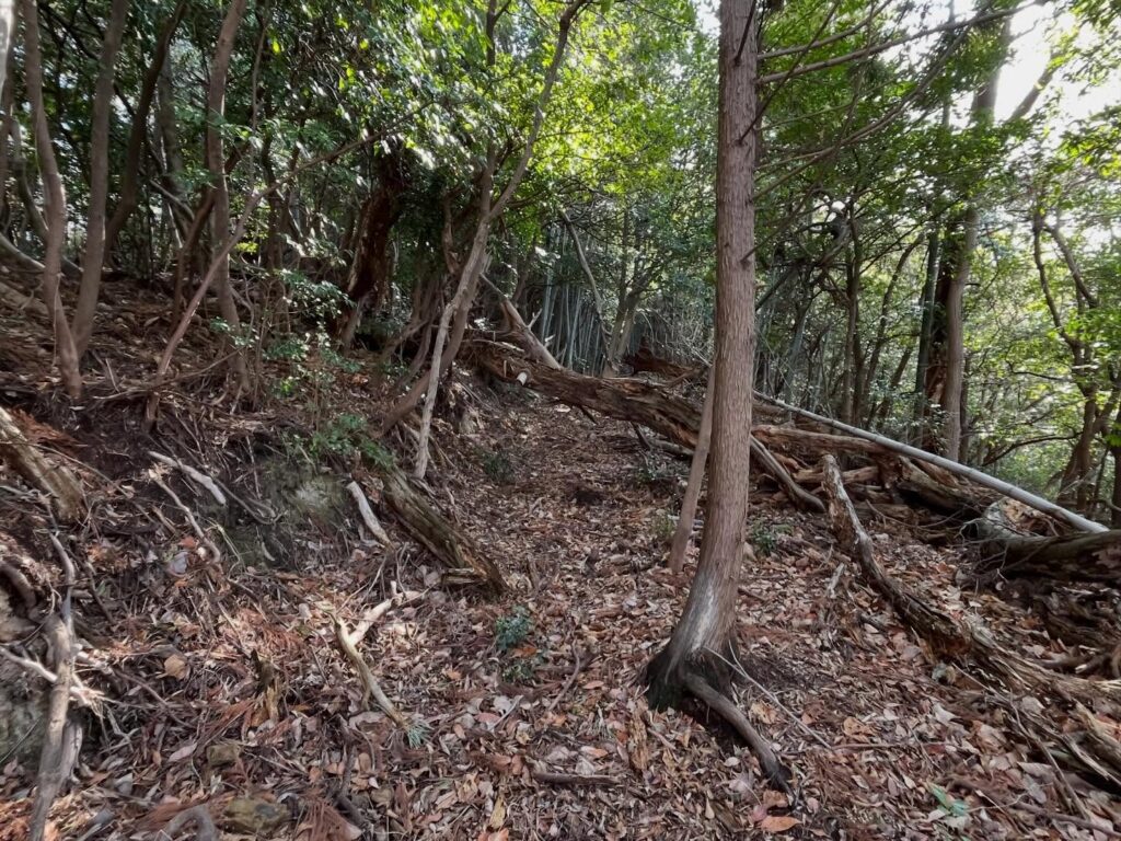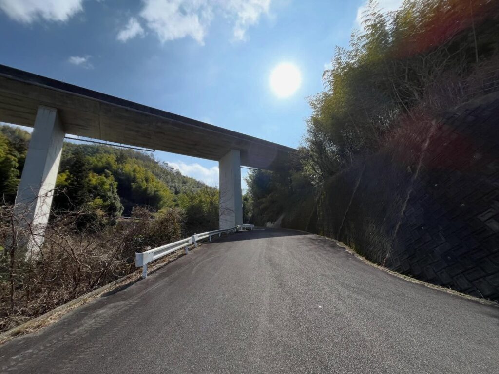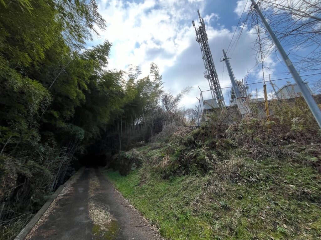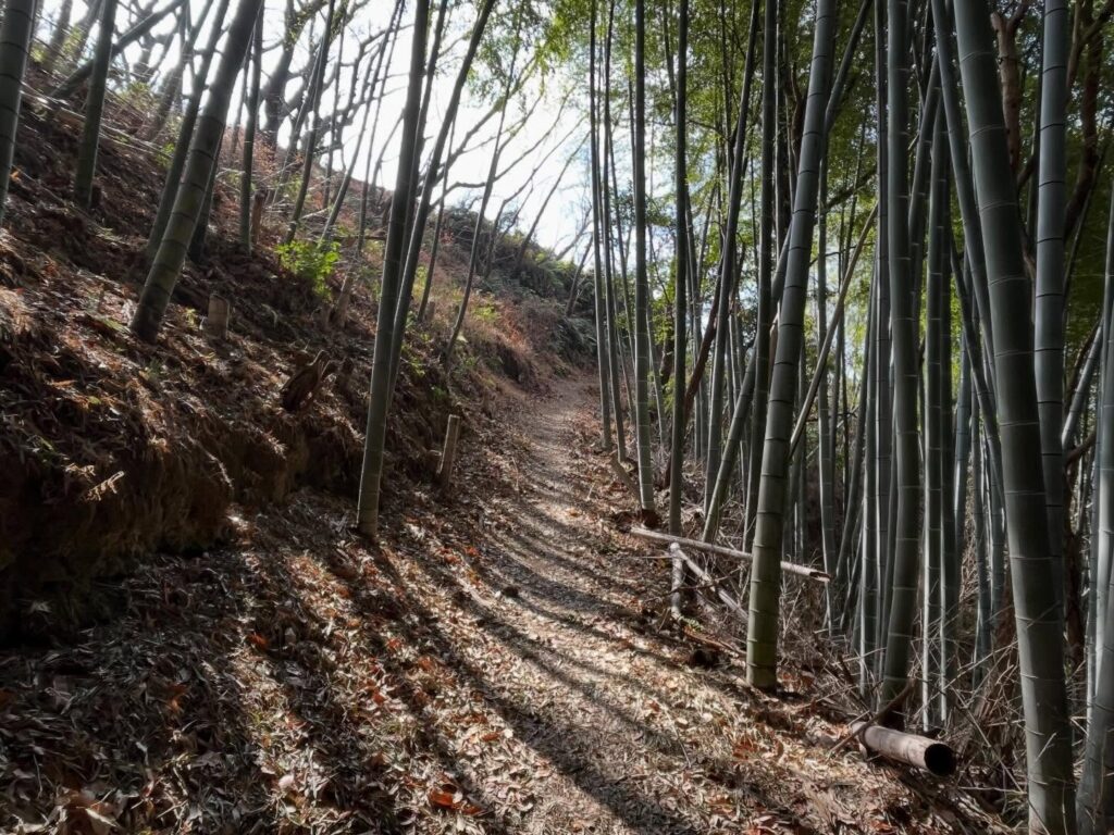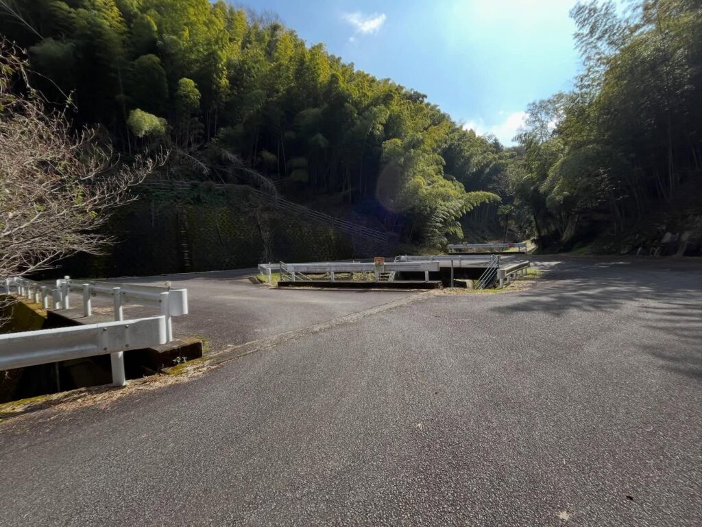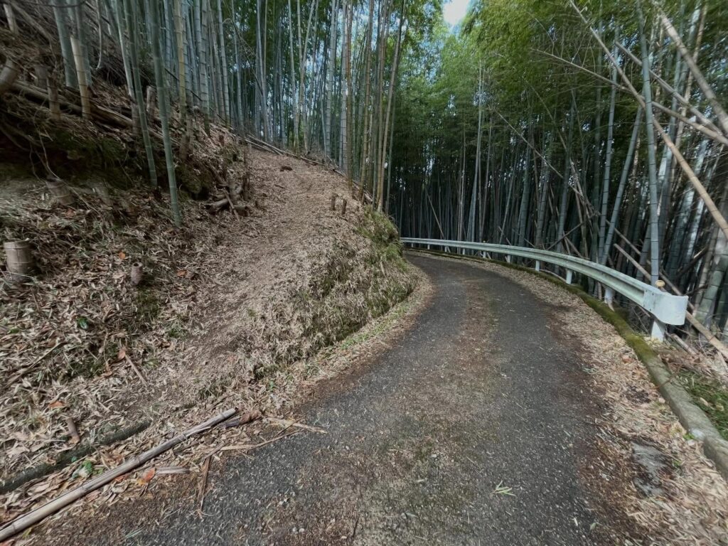 From here, follow the road slightly uphill. You’ll see a bamboo grove. Near the edge of the bamboo grove and the guardrail, there’s a path leading up to the right.