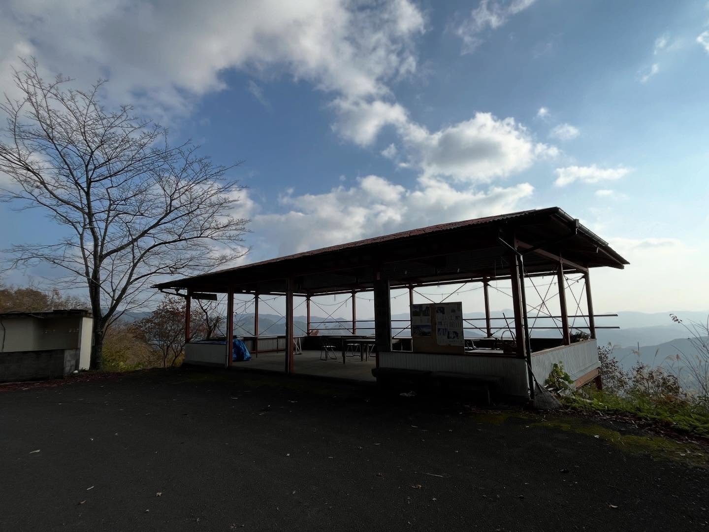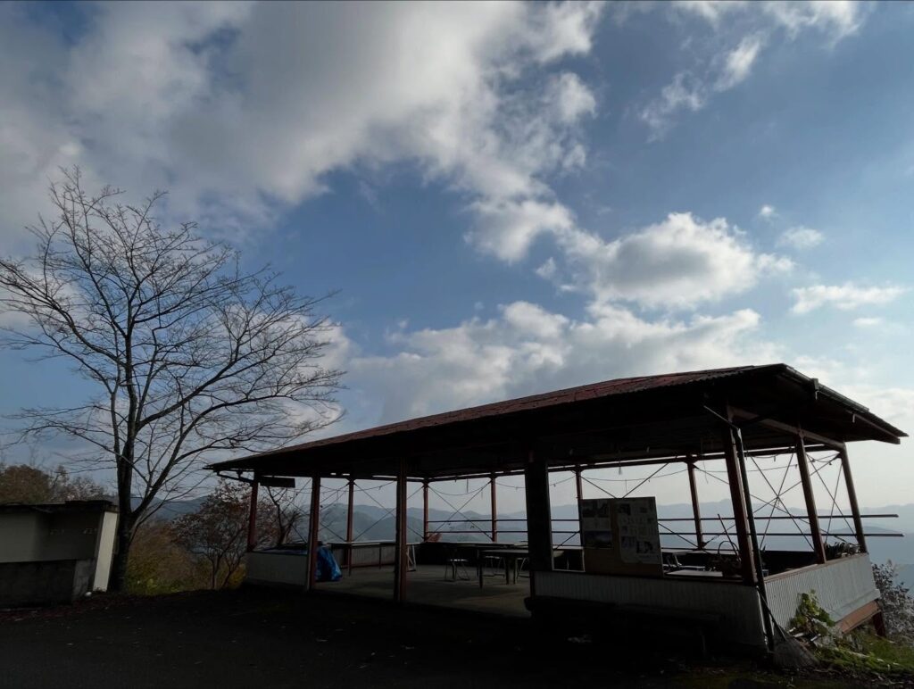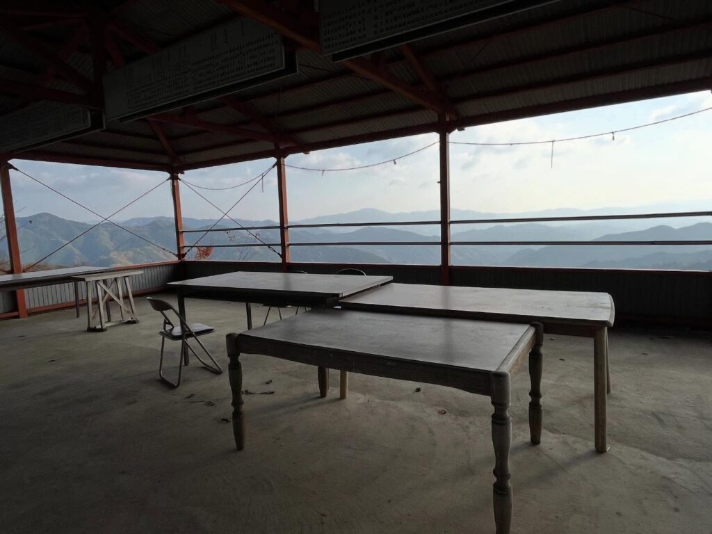 突然、屋根付きの眺望スポットがあり、テーブルや椅子も置かれています。