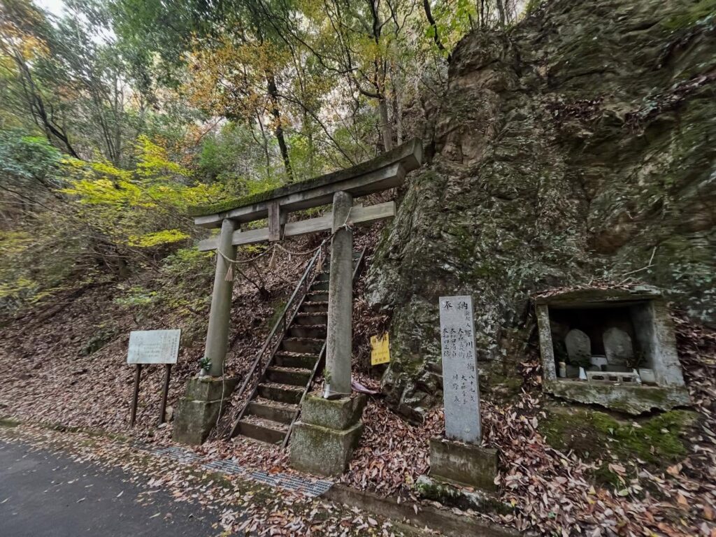 At the Mount Dakeyama Worship Site, after paying respects to Mount Ishizuchi, turn back toward the roadside and you’ll see a torii gate on the mountainside.