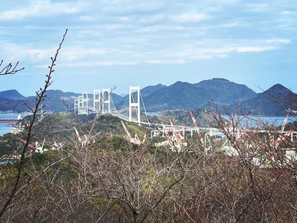 From the top of the mountain, you can enjoy a wonderful view of the Shimanami islands, the Kurushima Kaikyo Bridge, and the direction of Mount Takanawa.
