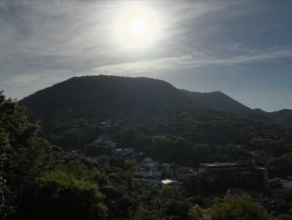 夕日の中、先ほどまでいた大麻山と象頭山を眺めることができます。