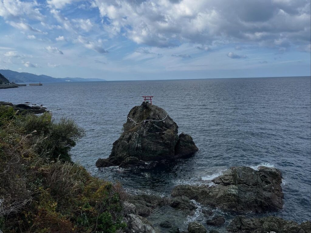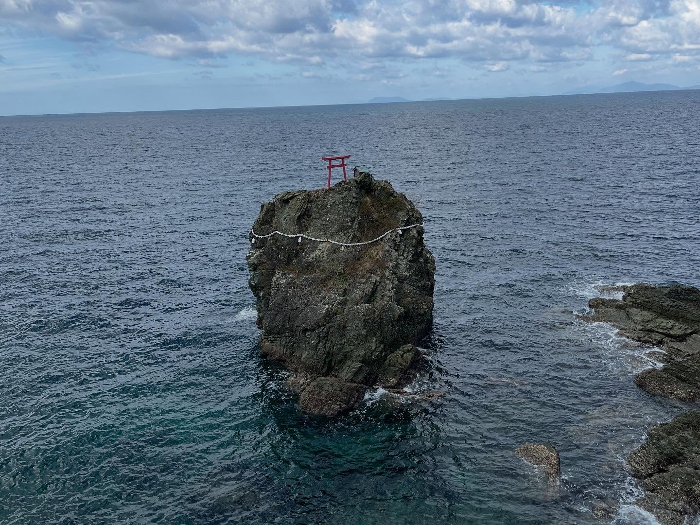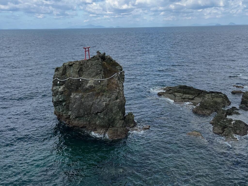 A torii gate and a shrine dedicated to Mishima Daimyojin stand atop Tsunakake Rock.
