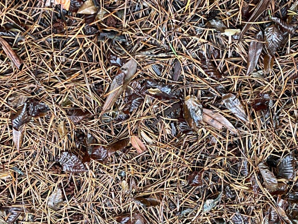このコウヤマキの葉が地面に積もっているのですが、不思議と滑ることなく歩きやすいのですよね。