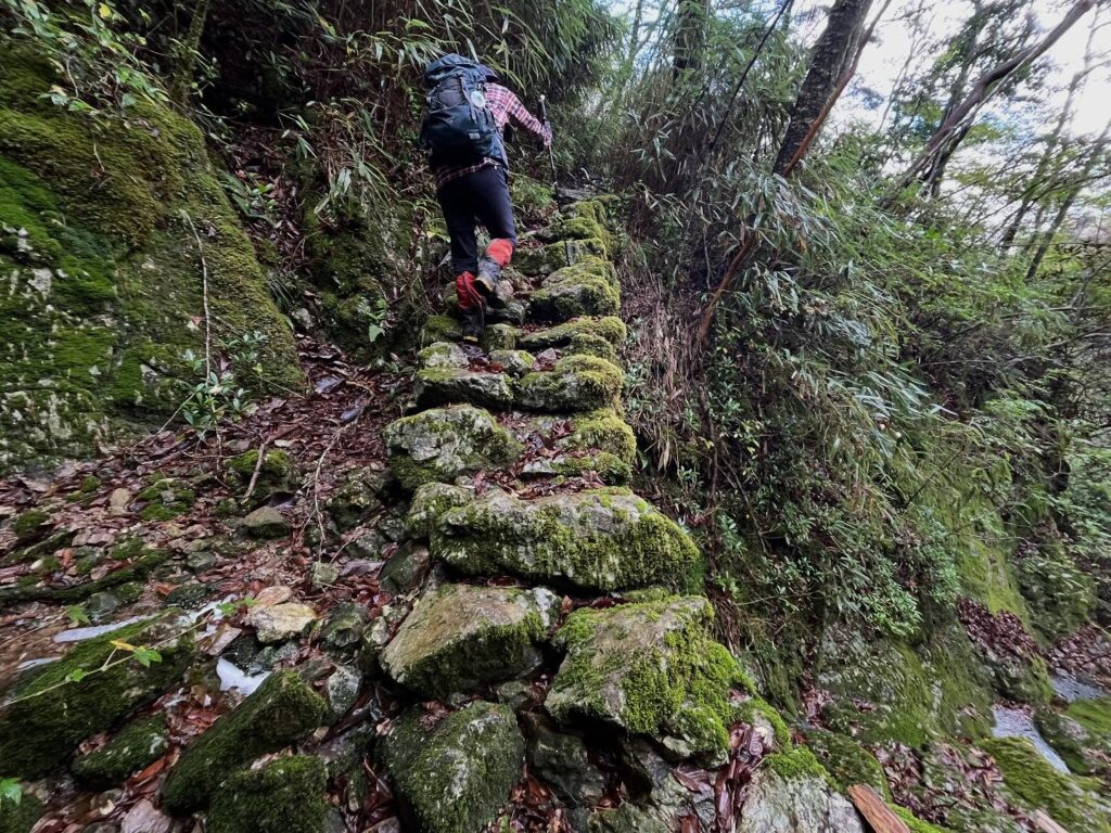 登山道は枝や岩で階段のような感じです