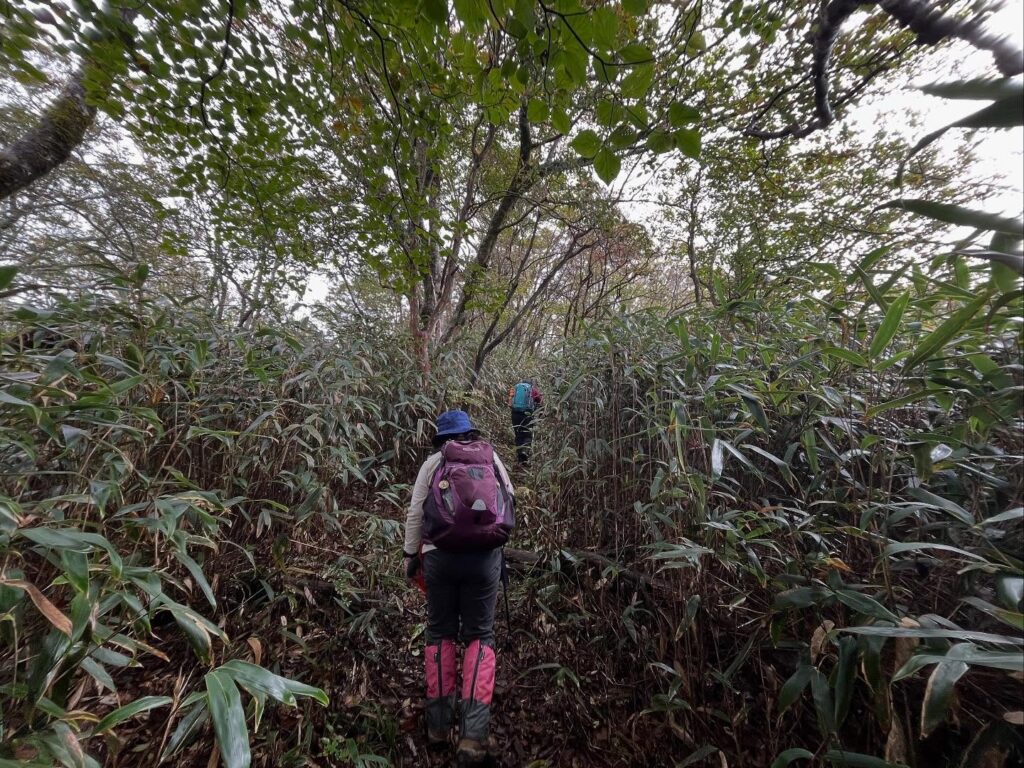 濡れた笹が道を塞ぎ、笹を払いながら進んでいきます。