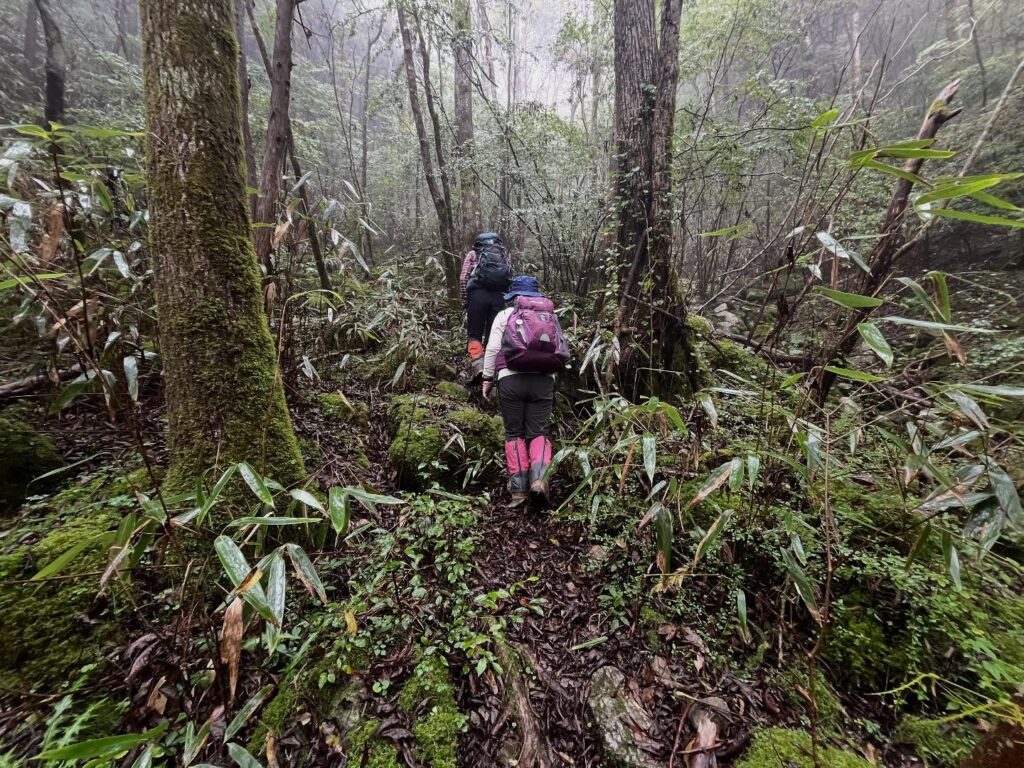 Wet bamboo grass blocked the path, forcing us to push through it as we advanced.