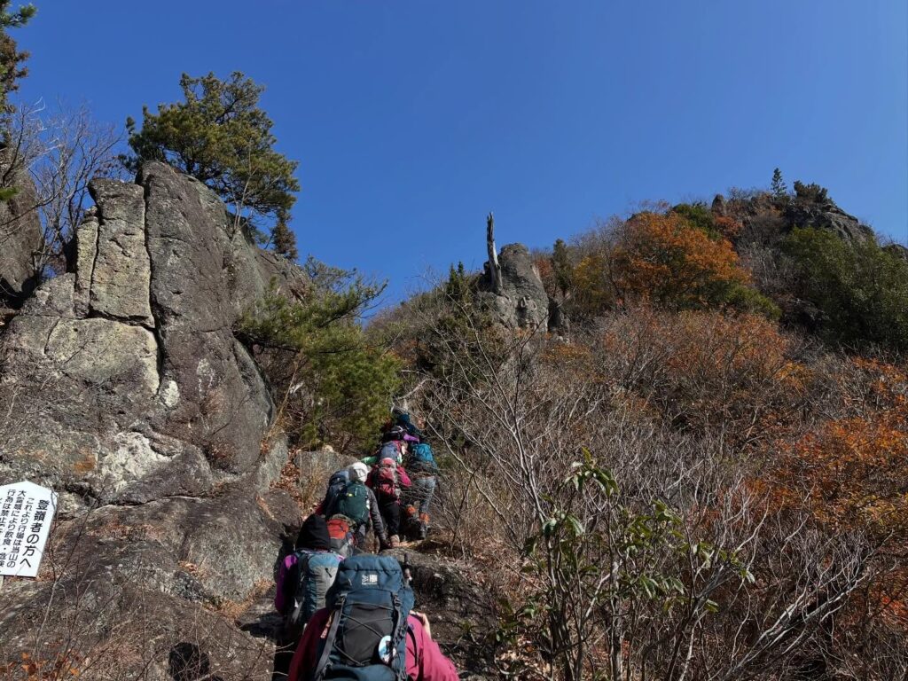 ストックは仕舞って、滑り止めの手袋をつけ、岩山に取りつきます。