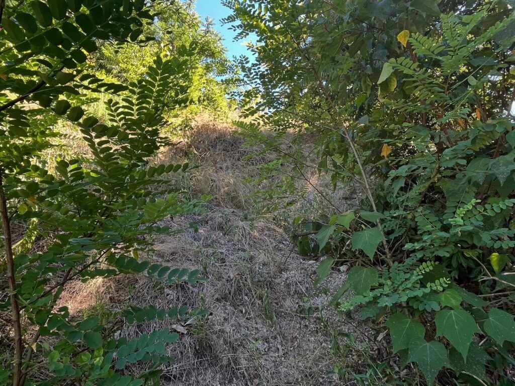 木々の下に踏み跡の道があります