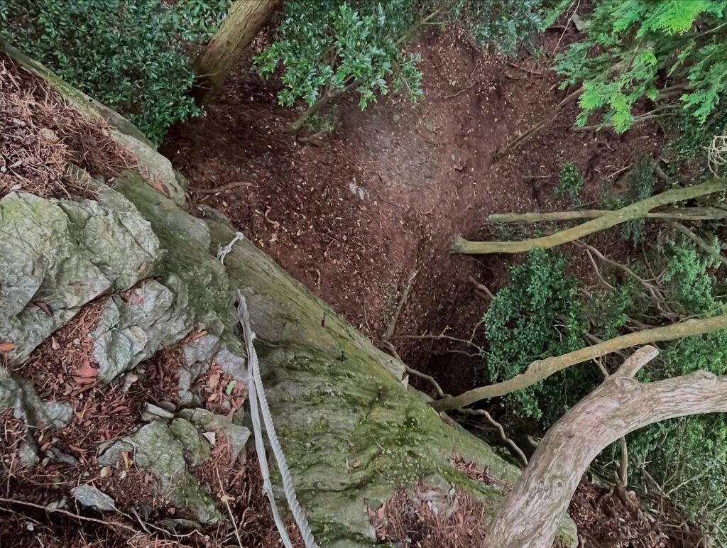 The rope is a bit short, but we carefully lower ourselves down, securing our footing step by step.